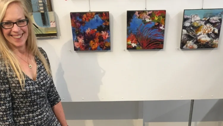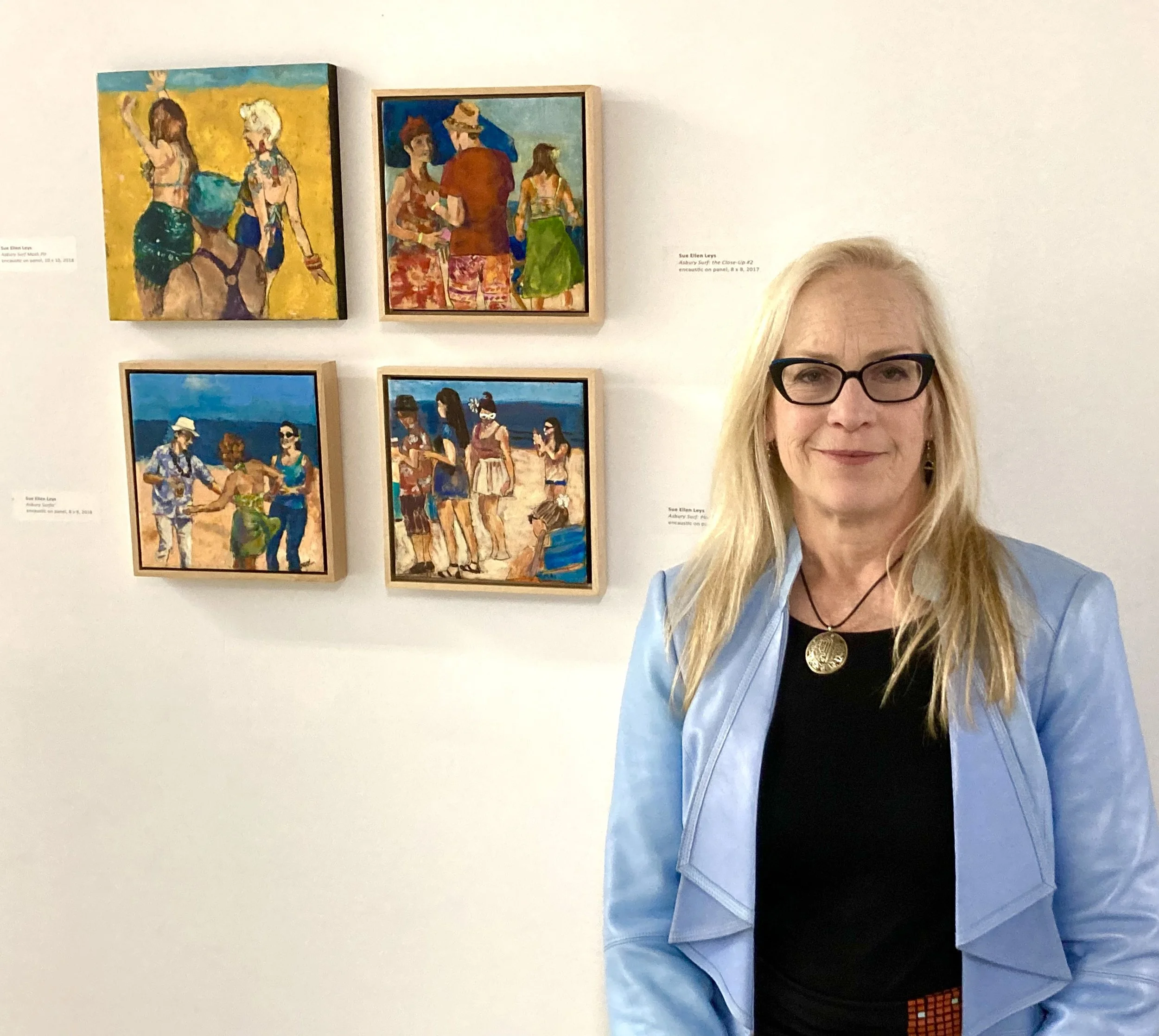 The artist pictured with 3 encaustics among other work at Open Orange.